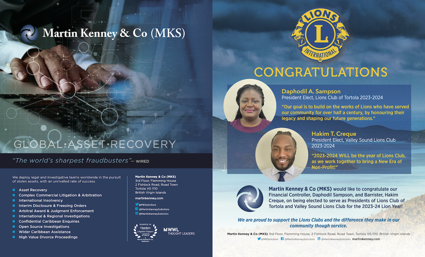 MKS would like to offer its hearty congratulations to Daphodil Sampson, our Financial Controller, and Hakim Creque, Barrister, who have been chosen as President Elects for Lions Club of Tortola and Valley Sound Lions Club, respectively.