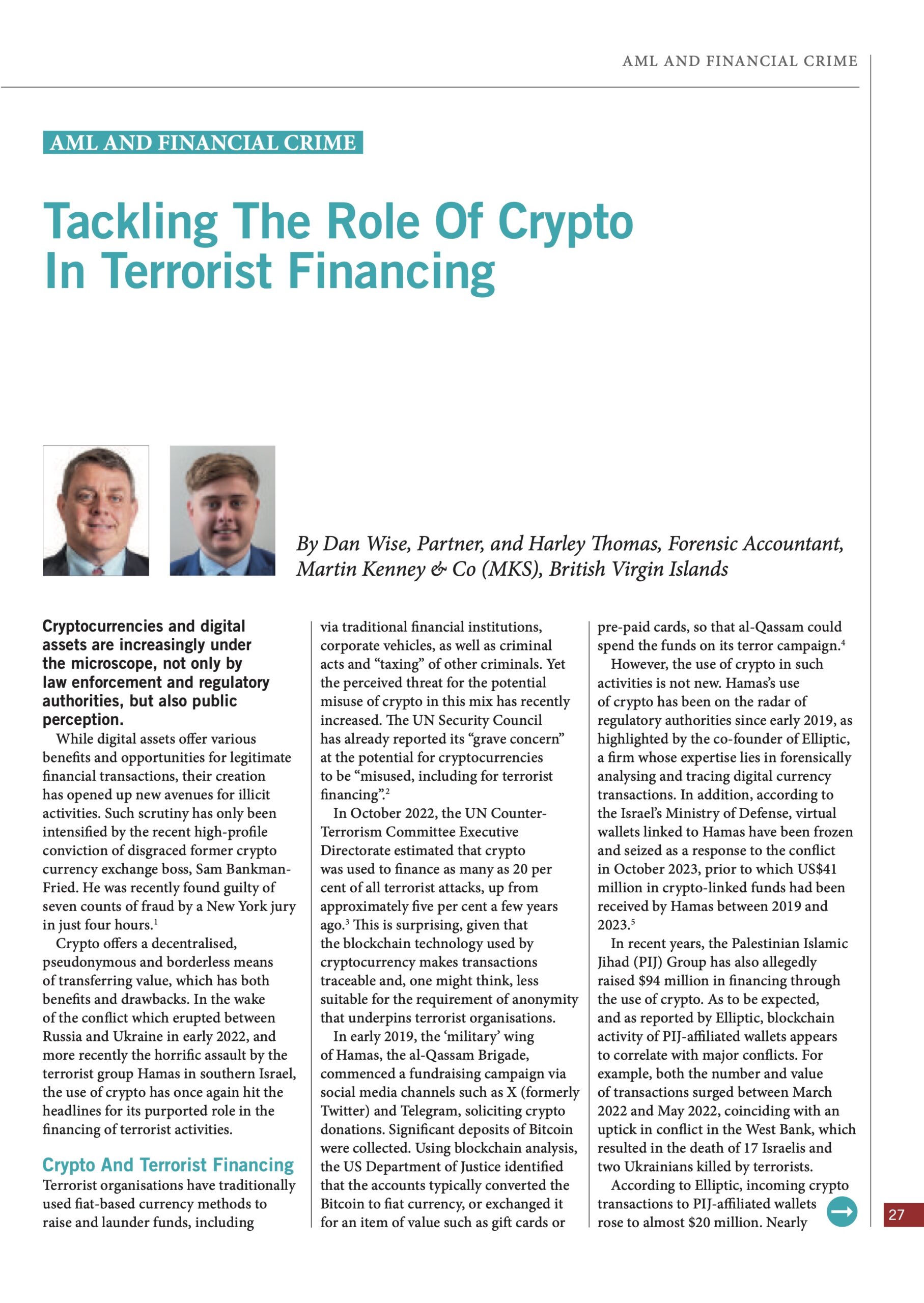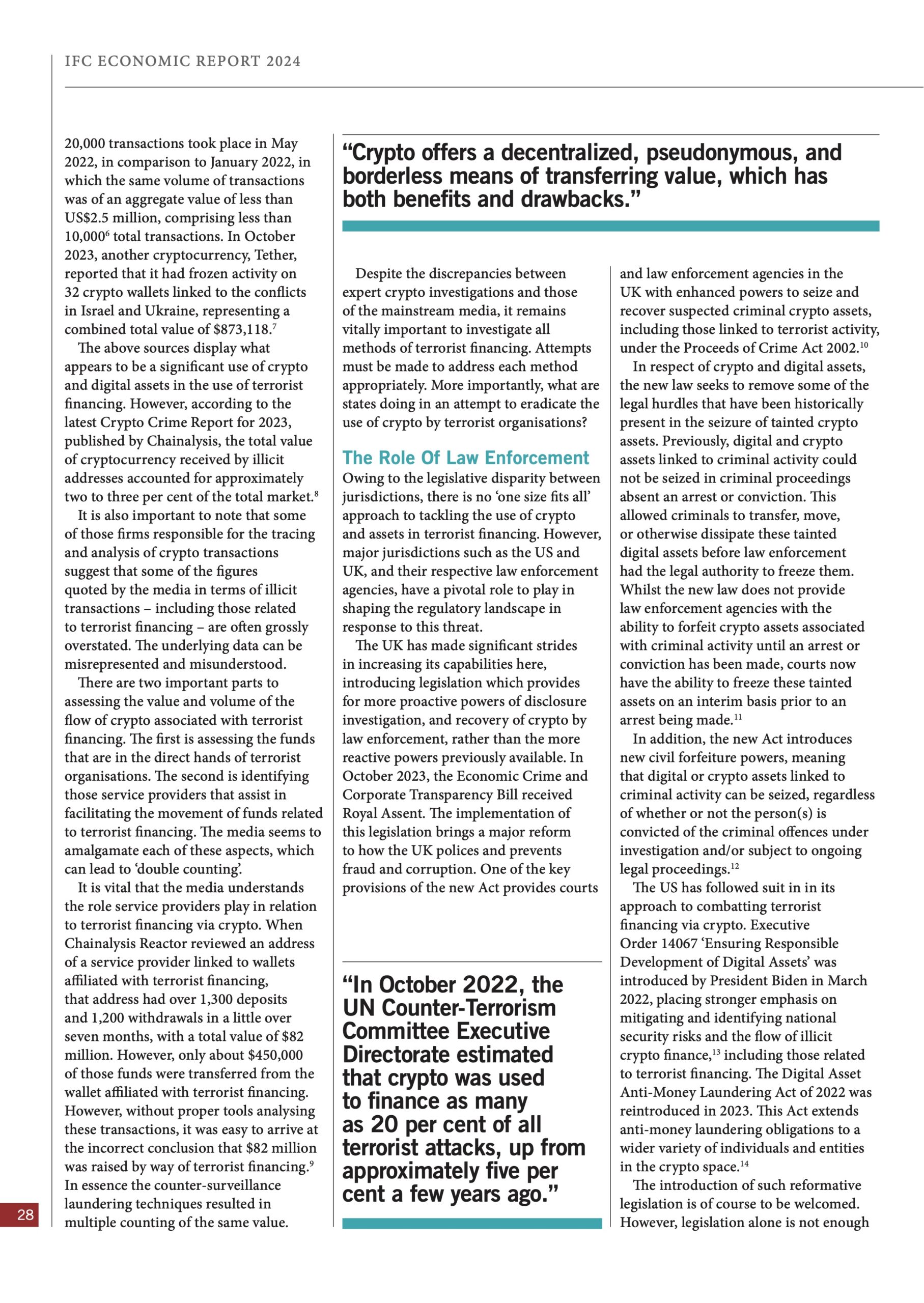 In this exclusive article for the IFC Economic Report 2024, Dan Wise and Harley Thomas examine what role – if any – crypto can, or might be, playing in funding terrorist organisations and what might be done in response to that threat.